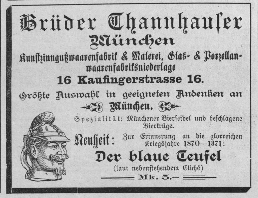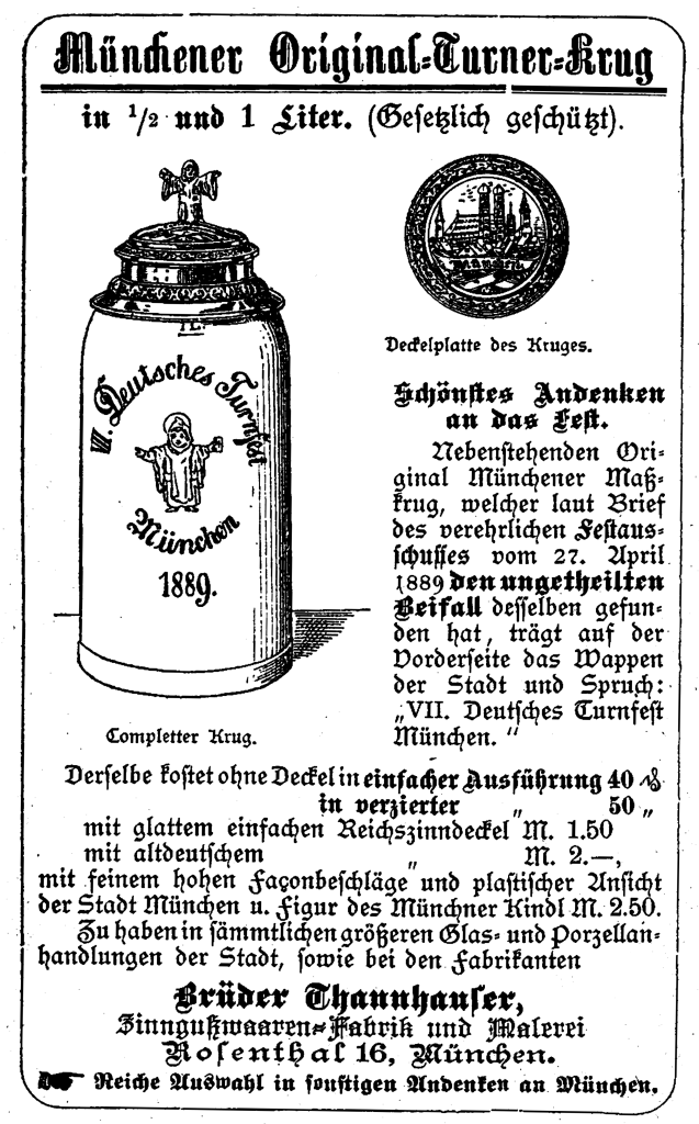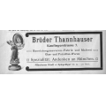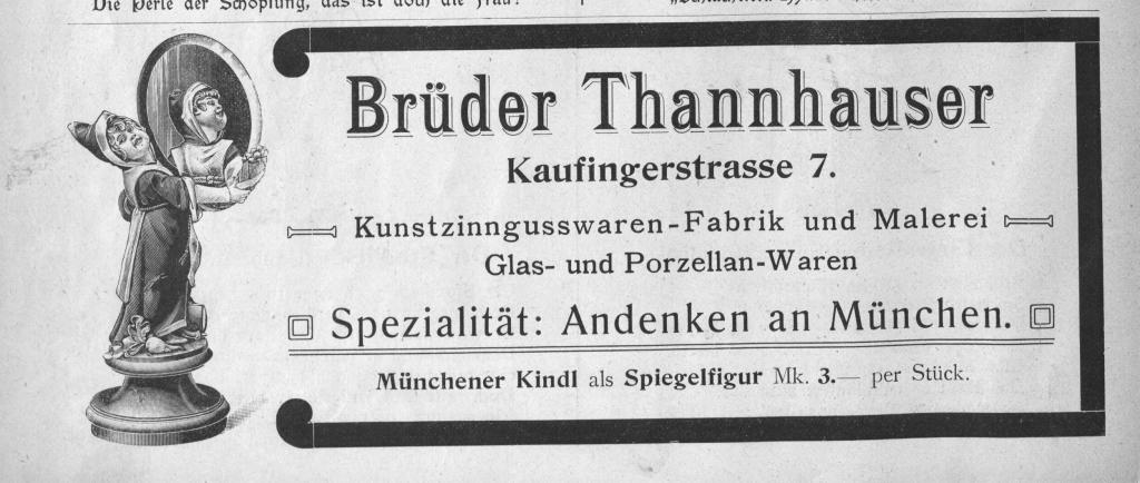 Die Brüder Thannhauser produzierten das gesamte Spektrum an Bierkrügen, darunter auch aufwändig gestaltete Figurenkrüge, die sich im letzten Drittel des 19. Jahrhunderts großer Beliebtheit erfreuten. Ihre massenhafte Herstellung wurde mit der fortschreitenden semi-industriellen Modelproduktion möglich. Dennoch blieben sie überwiegend Sammlerstücke bzw. Andenken, die sich schon aufgrund ihrer vergleichsweise hohen Preise nicht für den täglichen Gebrauch eigneten. Um 1896 übersiedelten die Brüder Thannhauser in ein neues Werkstätten- und Geschäftslokal näher am Marienplatz (Kaufinger Straße 7). Als die humoristischen, aber überladenen Figurenkrüge zur Jahrhundertwende aus der Mode gerieten, reagierten auch die Brüder Thannhauser und stellten ihr Sortiment dem Zeitgeschmack entsprechend um. Durch die Zusammenarbeit mit renommierten Künstlern wie Franz Ringer, Eugen von Baumgarten und Emanuel von Seidl produzierten sie ansprechende Jugendstil-Kleinkunstwerke, die heute begehrte Sammlerstücke sind. Wie die anderen Bierkrugveredler "veredelten" die Brüder Thannhauser auch Krüge für große Münchner Industriebrauereien und ausländische Großkunden. Im Jahr 1904 machte die Firma alleine mit ihrem Münchner Kindl-Nippes einen Umsatz von über einer Viertelmillion Mark (Destouches 1903). Gesundheitliche Probleme machten es den Brüdern zusehends schwerer, den Betrieb fortzführen. Albert Thannhauser starb im Juli 1916, kurz darauf legte Josef Salomon seine Gewerbeberechtigung nieder und verstarb ebenfalls nur wenige Monate später. Krüge der Firma Thannhauser sind im Münchner Bier- und Oktoberfestmuseum ausgestellt.