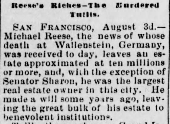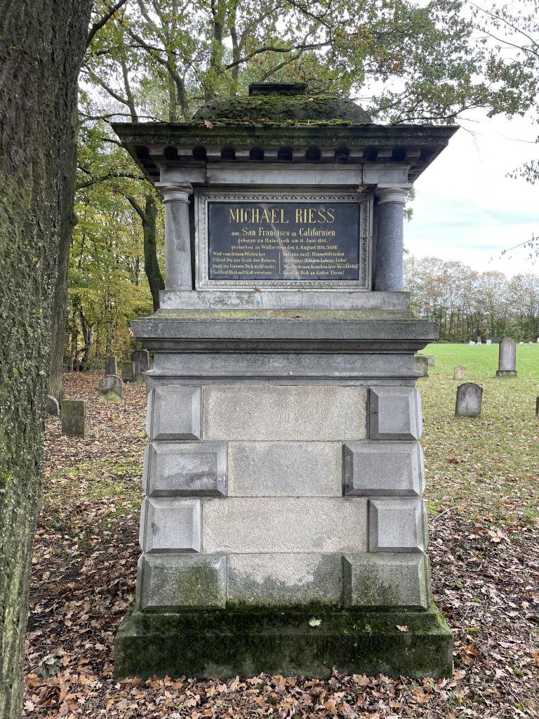In Chicago und San Francisco ist der Name Michael Reese bis heute ein wichtiger Teil der Stadtgeschichte. In seiner alten Heimat jedoch geriet Nathan Michael Ries in Vergessenheit. Um sein prachtvolles Grabmal auf dem jüdischen Friedhof in Wallerstein spinnt sich allerdings die Legende um einen spleenigen Millionär, den angeblich der Schlag traf, als er dem Friedhofswärter ein Trinkgeld geben sollte...