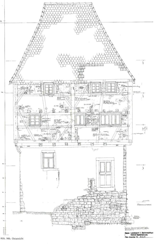Die Innenkonzeption lässt sich aufgrund der vielen späteren Baueingriffe nicht mehr rekonstruieren. Um 1400 und später wieder in der Mitte des 15. Jahrhunderts nahm man neue Raumunterteilungen zuerst im Fachwerkaufbau, dann im Steinsockel vor. An der Nordwand wurde ein Brunnenschacht abgeteuft, der später als Kloake genutzt wurde. Dendrodatiert sind 1562/63 weitere Veränderungen an der Ausstattung. Im frühen 17. Jahrhundert wurde der Keller eingewölbt, was zur Anhebung der Innengeschosse führte. Außerdem wurde der Bau nach Norden erweitert.