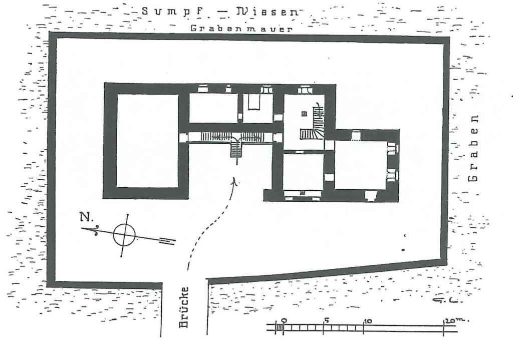 Das Wasserschloss liegt abgeschieden und einsam auf einer rechteckigen, ummauerten Plattform inmitten von Wassergräben, die nach Osten und Nordosten in einen großen Weiher übergehen. Der Zugang führt von Westen von der ehemaligen Vorburg über eine Brücke in den heute offenen, einst aber durch eine Frontmauer geschlossenen Burghof. Die dreiflügelige Innenhofbebauung setzt sich aus drei separaten Baukörpern zusammen: dem ältesten viergeschossigen Wohnturm an der Südseite, dem winkelförmigen Verbindungstrakt mit seinen beiden Fachwerkgeschossen und dem viergeschossigen Wohnturm an der Nordseite. Beide Wohntürme besaßen mehrere Aborterker, waren über dem Erdgeschoss eingewölbt und darüber mit hölzernen Flachdecken versehen. Der Zustand des Wasserschlosses – eigentlich vom Erscheinungsbild her noch immer eher eine Burg – ist sehr gut und gepflegt.