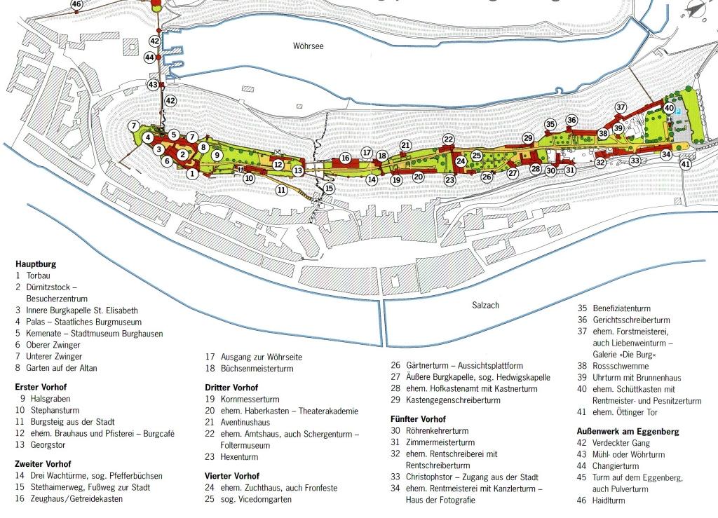 Die auf dem wasserumwehrten Sporn gelegene Burg "im Osten die Salzach, im Westen der Wöhrsee" hat bis heute ihre eindrucksvolle Länge von 1 km sowie ihre Unterteilung in fünf Vorburgen und die Hauptburg am südlichen Spornende bewahren können, wenngleich manche Gebäude stark überformt oder beseitigt wurden. Dort, wo man heute parkt, riegelte früher ein starkes, 1800/01 abgerissenes Artilleriebollwerk den Zugang ab. Die Vorburgen zeigen noch immer eine dichte Bebauung und werden heute unterschiedlich genutzt. Sehenswert ist das Zeughaus im Zweiten Vorhof, während der Haberkasten des Dritten Vorhofs dem Neubau der Theaterakademie weichen musste. Die innerste, erste Vorburg beeindruckt durch ihren wuchtigen Frontbau mit dem Georgstor und enthält heute ein Burgcafé an der Stelle der alten Pfisterei. Die Hauptburg ist frontseitig durch einen gewaltigen Halsgraben, eine Schildmauer mit hölzernem Wehrschirm und den Bergfried (1482 eingestürzt und völlig neu errichtet) bewehrt (allesamt um 1480/1500). Den malerischen Innenhof umsäumen Dürnitz, Fürstenbau (= Palas) und Kemenatenbau. Heute ist die Burg durch ein in der Dürnitz installiertes Besucherzentrum sehr gut erschlossen.