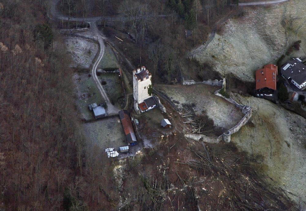 Über die Baugeschichte ist in Ermangelung kompetenter Bauforschung wenig bekannt, zudem das Mauerwerk des Bergfrieds dick überputzt ist. Die Burg soll um 1300 erbaut worden sein. Der schlanke Bergfried (nur 8 Meter Seitenlänge) sowie ein daneben liegendes Fragment der Ummauerung mit Fischgrätmauerwerk (opus spicatum) dürften aus dieser Zeit stammen.
