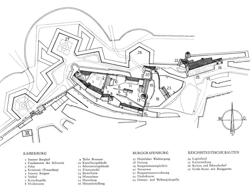 Die Burggrafenburg weist als ältestes Bauteil den in der 2. Hälfte des 12. Jhdts. erbauten Fünfeckturm aus, während die Walburgiskapelle im 2. Viertel des 13. Jhdts. hinzu kam. Das Burgamtmannsgebäude entstand um 1430, die Kaiserstallung 1494/95.