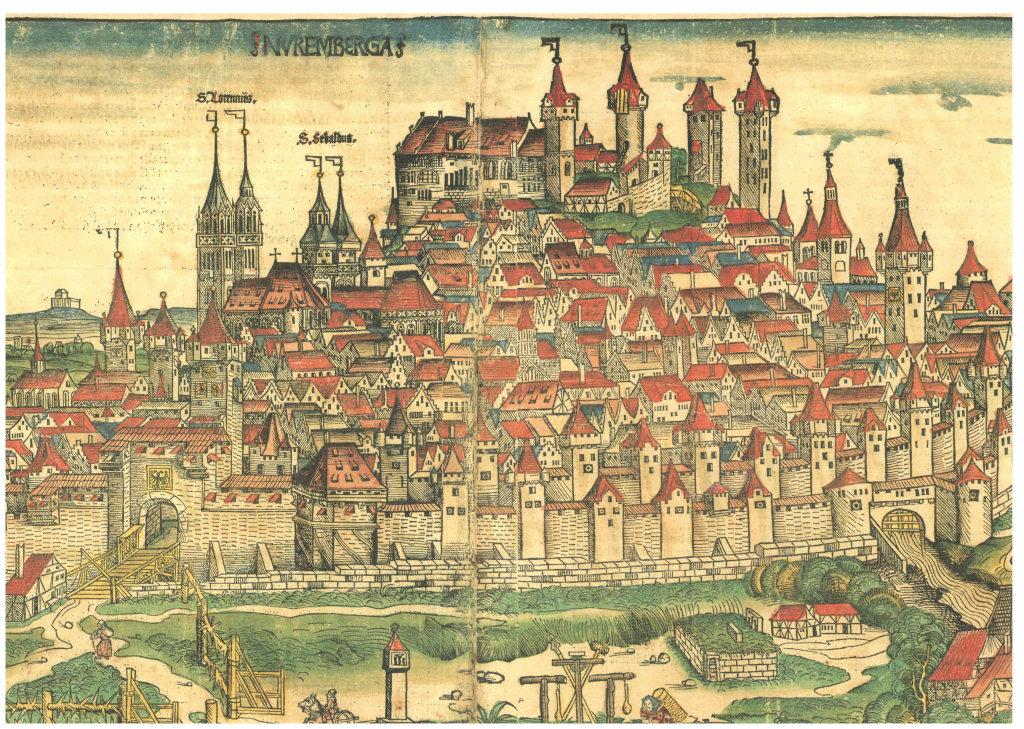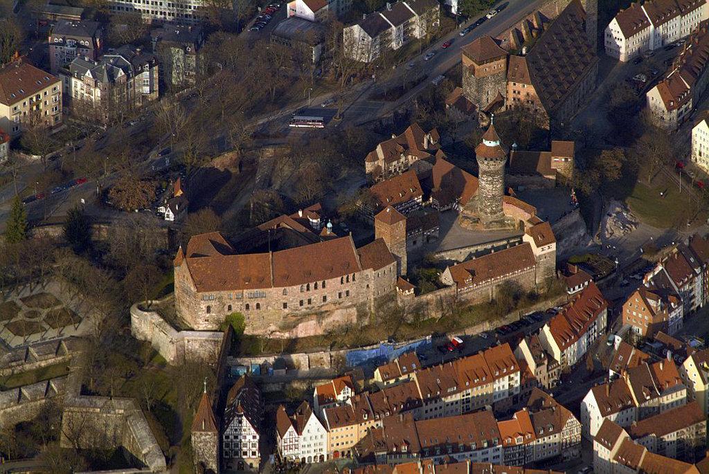 Der 1050 in N. abgehaltene Reichstag ist der erste konkrete Hinweis auf jene kaiserliche Burg (Pfalz), die König Heinrich V. 1105 belagerte und Kaiser Lothar von Supplinburg 1130 nach mehreren vergeblichen Versuchen eroberte. Kaiser Friedrich I. („Barbarossa“) nutzte die Burg zwischen 1156 und 1188 für etliche festliche Empfänge. Die Burg N. war auch für alle nachfolgenden Könige immer wieder Residenzort, auf dem Hof- und Reichstage stattfanden, und an dem sie immer wieder bauten. 1356 legte die „Goldene Bulle“ von Kaiser Karl IV. fest, dass künftighin jeder neue Herrscher seinen ersten Reichstag in oppida Nuremberg abzuhalten habe. Die zunehmenden Spannungen zwischen den Burggrafen von Zollern, die das Amt der Burggrafen (= Burgverwalter) von 1192 bis 1427 ausübten, eine eigene Burg auf der Osthälfte des Burgbergs besaßen, und der Stadt kulminierten 1420 in der Zerstörung der Burggrafenburg, die Burggraf Friedrich VI. schließlich 1427 der Stadt verkaufte. Im 16. Jhdt. verlor die Burg an Bedeutung, 1806 kam sie an Bayern. 1944/45 stark zerbombt, wurde sie sorgsam erneuert und untersteht heute der Bayerischen Schlösserverwaltung.