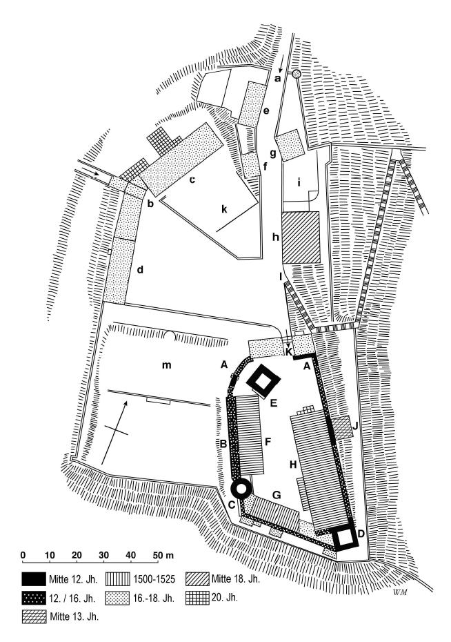 Die 1994 fachkundig untersuchte Burg soll mit ihrem Bergfried, dem Stumpf des runden Westturms, dem Untergeschoss des quadratischen Südturms und geringen Resten der Ringmauer der Bauzeit um 1150 angehören. Um 1500 und 1525 entstand unter den Bischöfen Lorenz von Bibra und Konrad von Thüngen eine Dreiflügelanlage in der Hauptburg, wobei der Westflügel eine ältere Schildmauer als Rückwand nutzte. Die Schäden von 1525 und aus dem Dreißigjährigen Krieg wurden umgehend behoben. 1625 errichtete man das innere Burgtor. Die zweifelsohne älteren Bauten aufsitzende Vorburg mit ihrem Burgtor stammt aus dem 16. bis 18. Jahrhundert und enthält eine spätbarocke Kellerei ("Amtshaus") von 1755/56. Kurz zuvor, um 1750, erfolgte der Umbau der Grabenanlage zum Barockgarten.