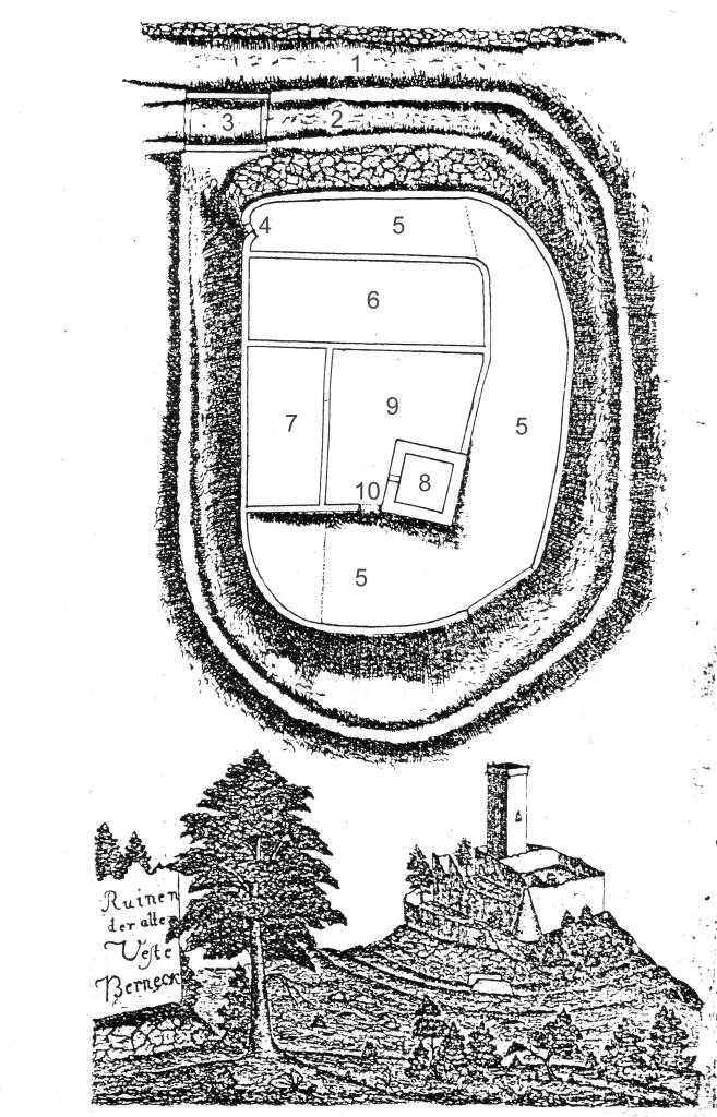 An der Nordseite des engen Burghofs erstreckt sich ein 1431 errichtetes, nur in Fragmenten erhaltenes Gebäude, das gegen ein an die Westseite gestelltes Gebäude stieß. Der alte, vermutlich Richtung Stadt orientierte Palas wurde offenbar 1430 restlos zerstört.