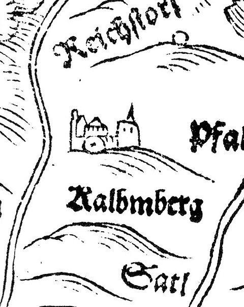 Schematische Ansicht der Burg Kalbmberg um 1568 mit drei turmartigen Bauten. Detail aus: Philipp Apian, Bairische Landtafeln, Blatt 7. Ingolstadt 1568.