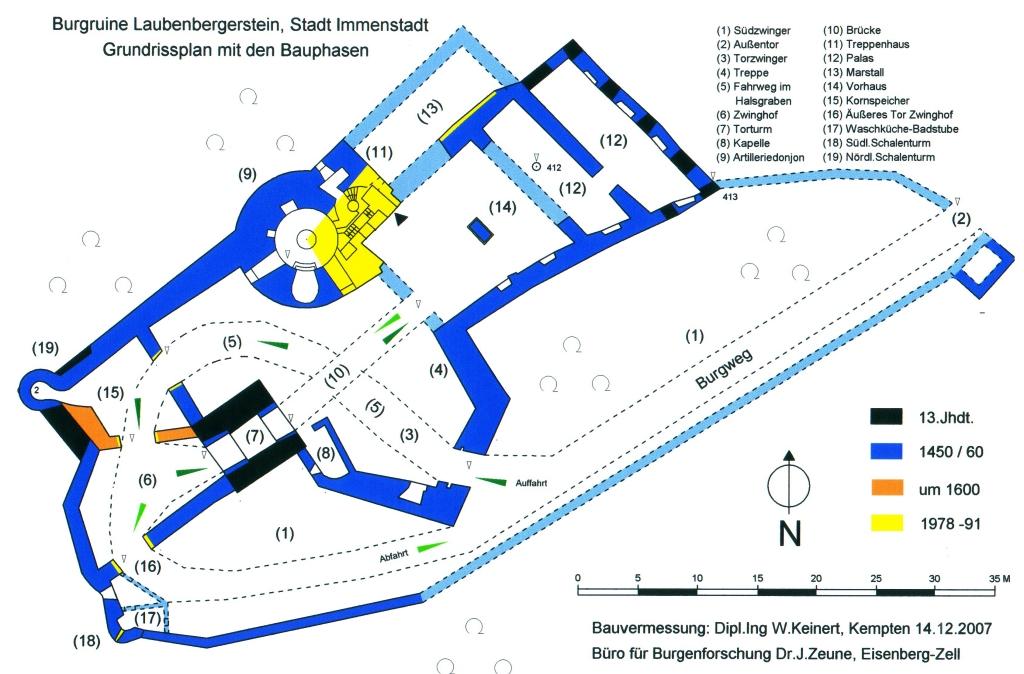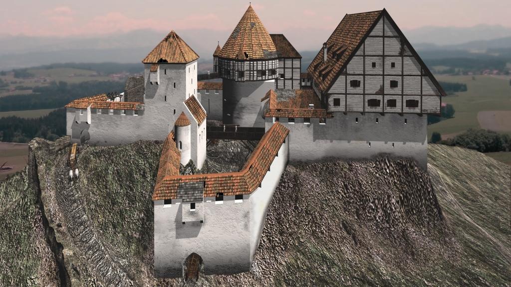 Die einen wichtigen Iller-Übergang kontrollierende Burg gehört zu den interessantesten Burganlagen Bayerns. Der Burgweg stieg entlang einer Zwingermauer an der Südseite des Hügels auf und führte zu einem wuchtigen Torzwinger, der eine steile, schleifenartige Auffahrt zur Kernburg durch den Halsgraben schützte. Dabei wurden die Kapelle und ein nach Westen vorgelagerter kleiner Torzwinger, der Zwinghof (1629 so genannt) mit Torturm, "eigentlich der alte Bergfried", passiert. Vom Torturm führten eine hölzerne Brücke und ein hoch gelegener Steg zur Hauptburg, die ein gewaltiger Artilleriedonjon frontseitig sicherte. An ihn war der einst zweigeteilte Palas angebaut, dessen Oberschosse aus Fachwerk bestanden. Die Karren konnten im Burghof der Kernburg wenden und dann auf einem weniger steilen Weg in einer großen Kurve die Burg durch ein anderes Außentor, neben dem sich Waschküche mit Badstüblein befanden, sicher verlassen.
