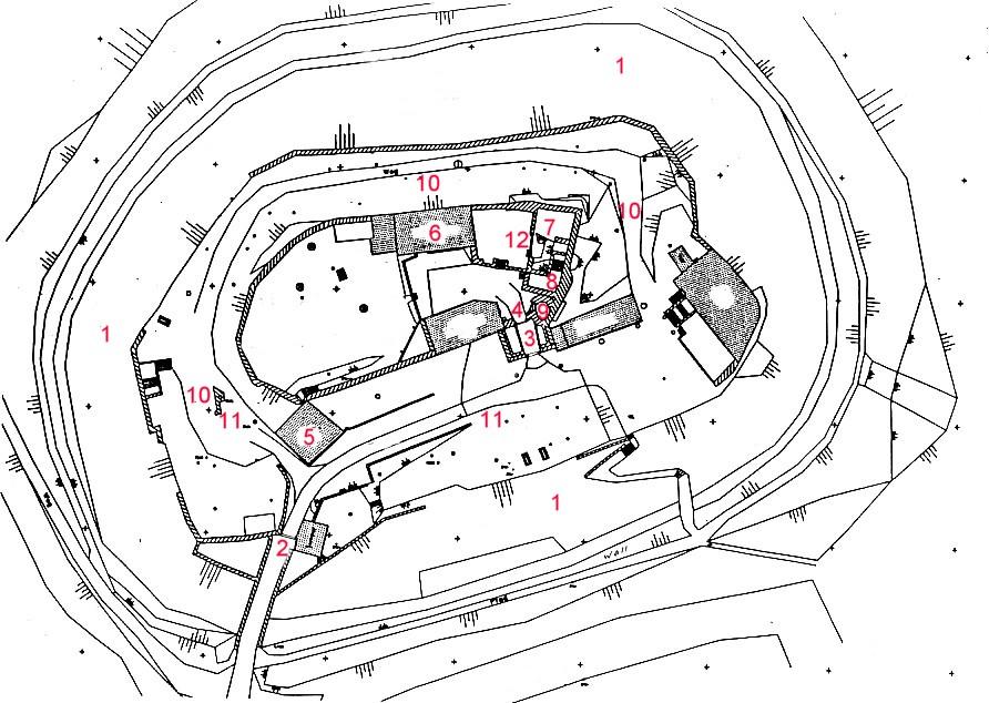 Imposant ragt die Gipfelburg mit ihrem 28 m hohen, weithin sichtbaren Bergfried auf. Gut erhalten hat sich der umlaufende Zwinger mit dem Außentor und dem mächtigen Graben. Kurios ist die Position des quadratischen, sich nach oben verjüngenden Bergfrieds (Seitenlänge 9,6 m; Mauerdicke 2,4 m), der komplett vom Südwesteck der Hauptburg-Ringmauer vorspringt und der große Buckelquader besitzt. Durch eine zweigeschossige Barbakane betritt man den Burghof, der nach Norden von der „Kemenate“ begrenzt wird, dem alten Palas (verbaute Doppelfenster). Von dem ihm später östlich angebauten Wohnbau verbleibt der mächtige Ostgiebel, von der alten Burgkapelle an der Ostseite lediglich der nördliche Innenansatz der Apsis samt romanischem Kapitell. Der im Obergeschoss erneuerte Bergfried ist begehbar, sein Hocheingang öffnet sich in 11 m Höhe. Die Kemenate beherbergt heute eine urige Burgschenke. Unbekannt ist die Bebauung der westlichen Hofhälfte.