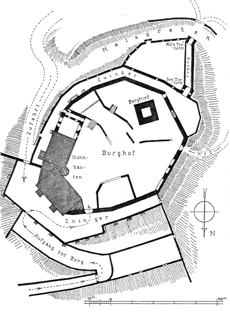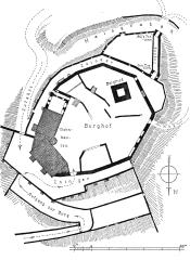 Ringmauer und Bergfried der Hauptburg gehören den Jahren kurz nach 1200 an. Den angeblich noch immer hölzernen Palas an der Nordostseite erneuerte Erzbischof Konrad von Weinsberg (1390-1396) in Stein und errichtete den Zwinger, der durch Traversen mit der Stadtbefestigung verbunden war. Erzbischof Diether von Isenburg bewehrte 1449 diesen Zwinger durch ein dreiseitiges südliches Torvorwerk, während Administrator Albert von Sachsen (1482-1484) den nördlichen Torzwinger schuf. Berthold von Henneberg (1484-1504) erweiterte den Palas nach Süden und versah ihn mit Erkern, von denen jener im 1. Stock bzw. Saal das Datum „1504" trägt und als Kapelle diente. Das Stallgebäude südlich des vergrößerten Palas zeigt noch sein Erbauungsdatum „1500". Nach der Zerstörung von 1552 erfolgte eine gründliche Instandsetzung im Stil der Renaissance, gut greifbar durch den „1565" datierten Westkamin des Saals und den polygonalen Treppenturm. Weitere Erneuerungsarbeiten führte man 1610 durch, als unter anderem die nordwestliche Ringmauer neu errichtet wurde.