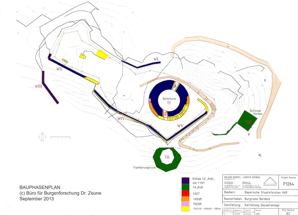 Ein höher gelegener, 1362 erwähnter Burgstall diente wohl dem 1104 erwähnten Timo von Nordeck als Sitz und wurde wohl bald nach 1115 von den Grafen von Henneberg durch eine neue, tiefer gelegene Burg ersetzt. Von dieser frühen Steinburg haben sich beachtliche Teile der Umwehrung, Fragmente eines Zwingers entlang der Südwest- und Südostseite sowie die nördliche Hälfte eines runden Wohnturms erhalten, gekennzeichnet durch gut behauenes und geschichtetes Handquadermauerwerk. Bergseitig existierte jenseits des Halsgrabens ein Vorwerk. Vermutlich im 14. Jahrhundert wurde die durch Überhöhung stark gefährdete Frontseite mit einem Achteckturm gesichert. Der Wohnturm zeigt Spuren umfassender Zerstörungen, die nach 1427 zur Neuerrichtung der Südhälfte und nach 1453 zu einer Aufstockung führten. Etliche Kastenamtsrechnungen von 1500/01 bis 1524/25 übermitteln viele interessante bauliche Details wie einen gedeckten Steg zwischen Kemenate und Palas sowie eine externe Wasserversorgung durch Tonröhren, weiterhin die Existenz eines Sommerhäusleins.
