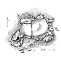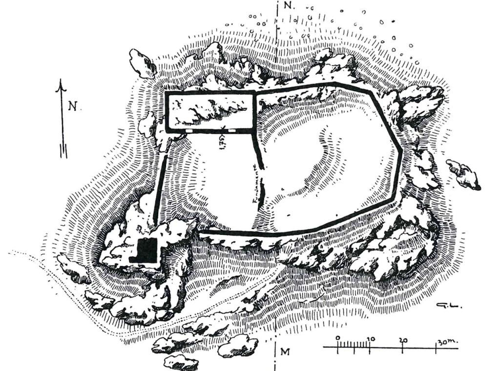 angepasste Ringmauer umfriedet ein 75 x 45 m großes Areal, das sich in eine