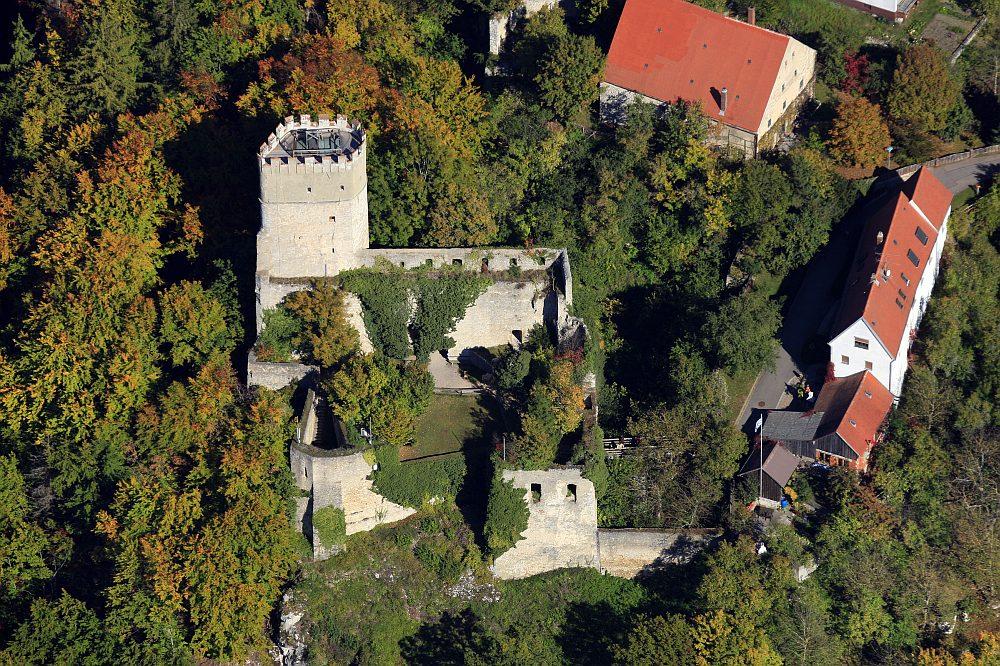 Die von einer Basaltkuppe oberhalb der Altmühl aufragende Burgruine bildet noch immer einen imposanten Anblick. Während der Fels nach Norden und Westen steil abfällt, grenzt nach Osten und Süden ebenerdiges Gelände an. Hier schützte ein winkelförmiger Halsgraben mit seitlichen Traversen die Hauptburg, die man von Südosten über die Vorburg erreichte.
