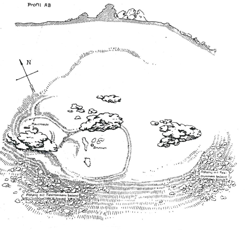 Von der restlichen Burganlage zeugen nur noch schwache Bebauungspuren auf den Felsen und ausgedehnte Schutthalden.