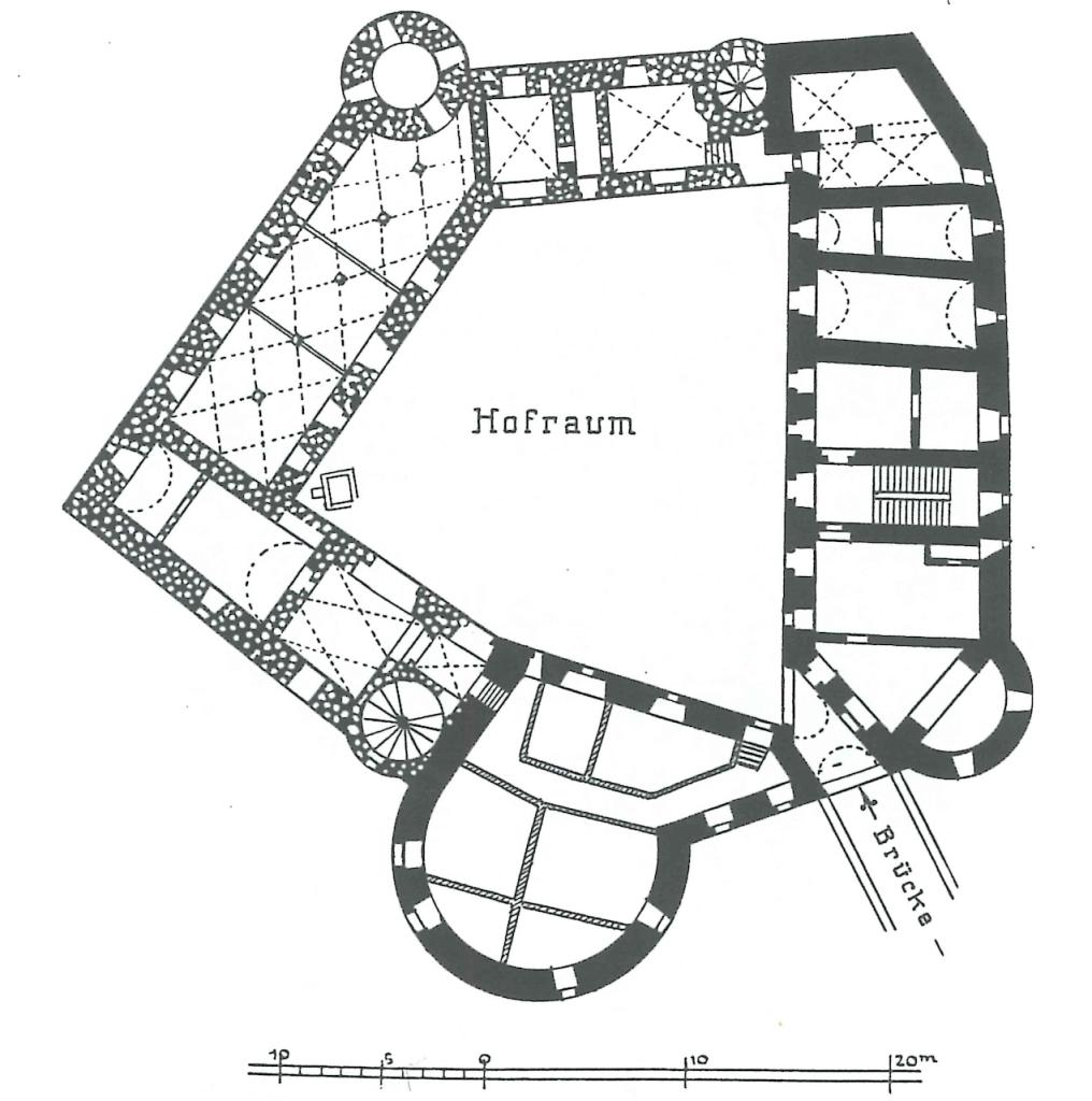 Das malerisch auf einer großflächigen Insel der Milz gelegene Burgschloss wird zurecht als eine der stimmungsvollsten Wasserburgen Deutschlands gerühmt. Der Zugang erfolgt von Osten über die Vorburg und einen Arm der Milz zu einem Torvorwerk mit einer großräumig umlaufender Zwingerbefestigung, die noch drei runde Ecktürme mit Fachwerkaufbau aufweist. Die durch einen breiten Wassergraben gesicherte Kernburg zeigt einen fünfeckigen Grundriss mit einer durchgängigen Randbebauung, wobei die Außenmauer auf einem Pfahlrost stehen soll. Frontseitig öffnet sich das Hauptportal zwischen zwei unterschiedlich großen Tortümen. Pittoresk ist das teilweise erneuerte, mit zahlreichen Erkern versehene Fachwerk auf dem älteren Burgteil der Westhälfte. Dominiert wird das Burgschloss von einem bergfriedartigen Rundturm am Südeck. Das Burginnere ist aufgrund seiner privaten Nutzung weitgehend unzugänglich.