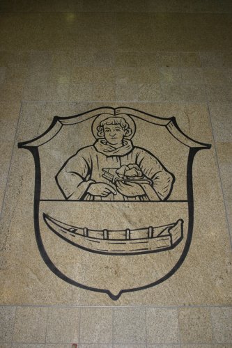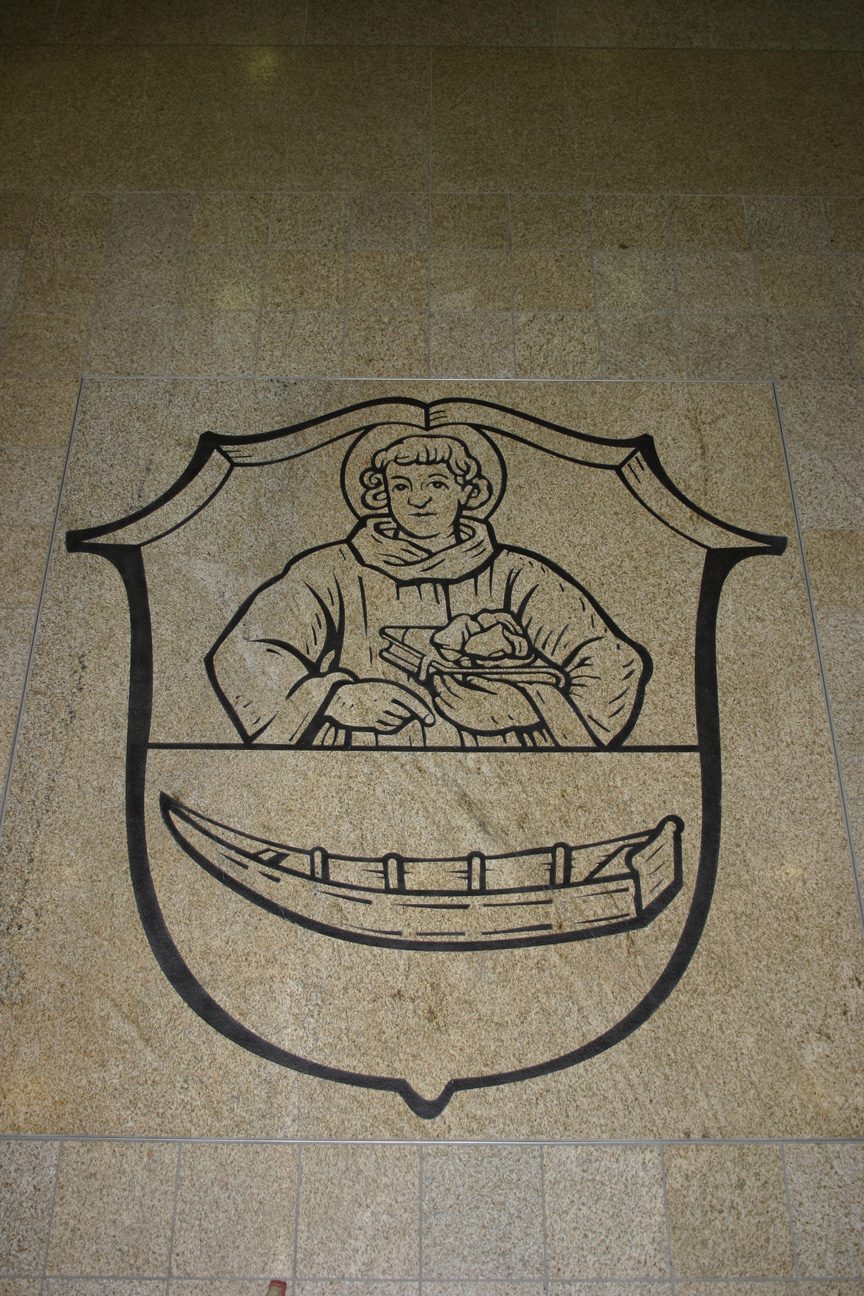 Im 2003 eingeweihten Rathaus von Stephanskirchen macht im Foyer diese schön gearbeitete Bodenplatte auf das Gemeindewappen aufmerksam.