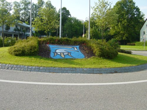Wappen der Gemeinde im Kreisverkehr am Ortseingang