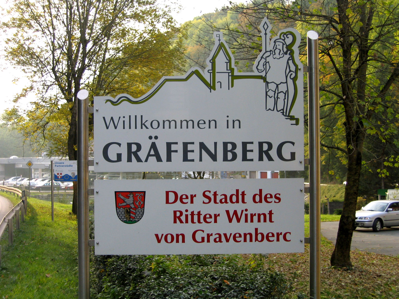 Begrüßungsschild an der B2 bei Gräfenberg mit dem Wappen der Stadt.