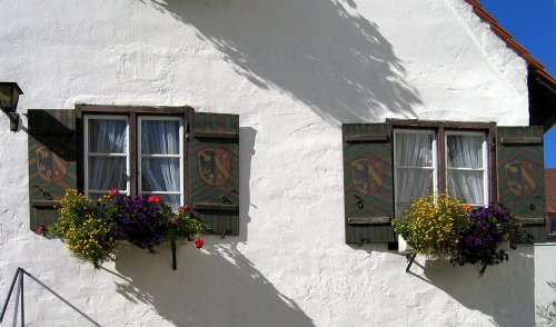 Stadtwappen von Kaufbeuren, aufgemalt auf Fensterläden eines Hauses in Kaufbeuren