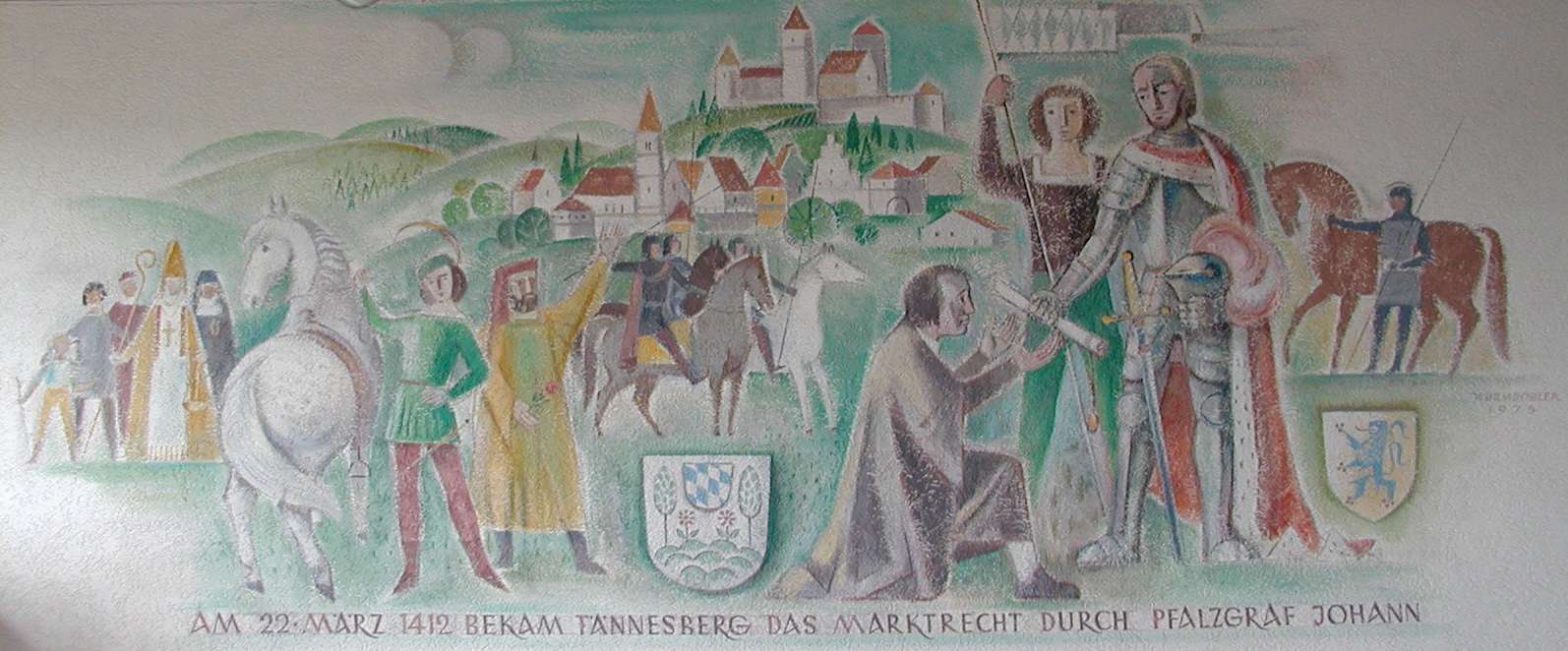 Das Gemälde im Sitzungssaal des Rathauses zeigt die Markterhebung von Tännesberg (22. März 1412), in der Mitte das Tännesberger Wappen.