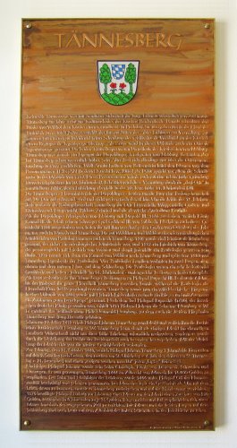Diese Kupfertafel hängt im Eingangsbereich des Rathauses von Tännesberg. Neben dem Marktwappen ist auf dieser Tafel die Entstehungsgeschichte des Marktes Tännesberg und einige andere interessante Auszüge aus der Geschichte des Marktes Tännesberg zu lesen. Der Text lautet wie folgt: