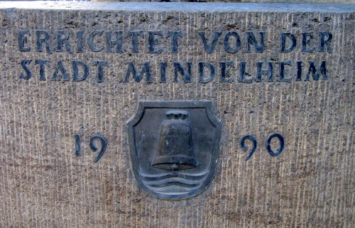 Das Stadtwappen von Mindelheim (Unterallgäu) an einem Brunnen.