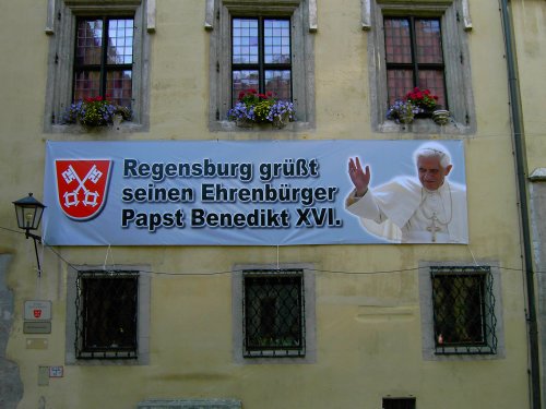 Transparent mit Stadtwappen am Alten Rathaus anlässlich des Papstbesuches vom 11.-14. September 2006 in Regensburg.