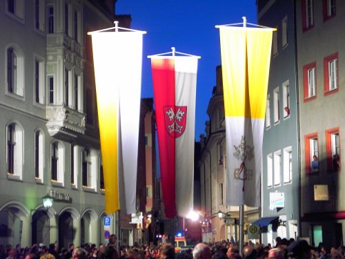 Die Regensburger Stadtfahne neben der Vatikanfahne auf dem Haidplatz nach der letzten Fahrt des Papstes durch die Altstadt von Regensburg am Abend des 12.9.2006.
