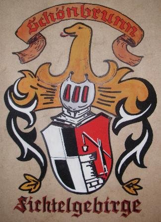 Wappen des ehemals selbstständigen Dorfes Schönbrunn im Fichtelgebirge, das heute zu Wunsiedel gehört (gemalt von A. Sirtl)