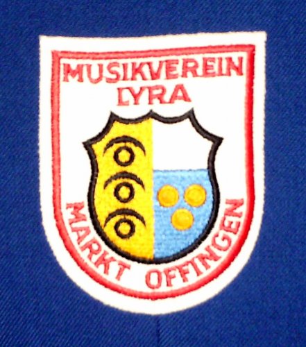Stoffabzeichen des Musikvereins "LYRA" Offingen e. V. mit dem Gemeindewappen