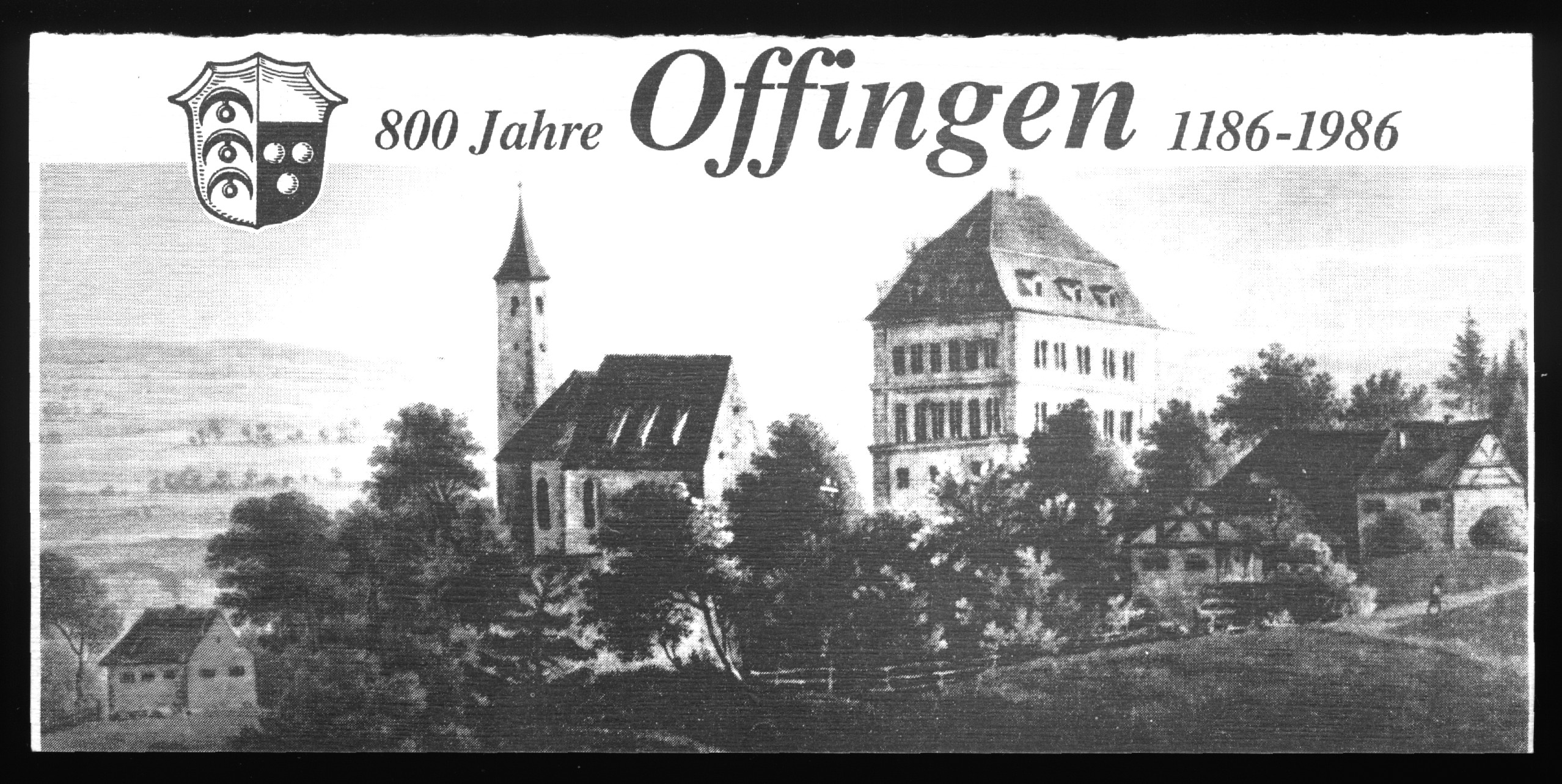 Einladungskarte zum Festakt der 800-Jahr-Feier der Marktgemeinde Offingen am 3. Oktober 1986. Neben dem Ortswappen sind Kirche und Schloss dargestellt.