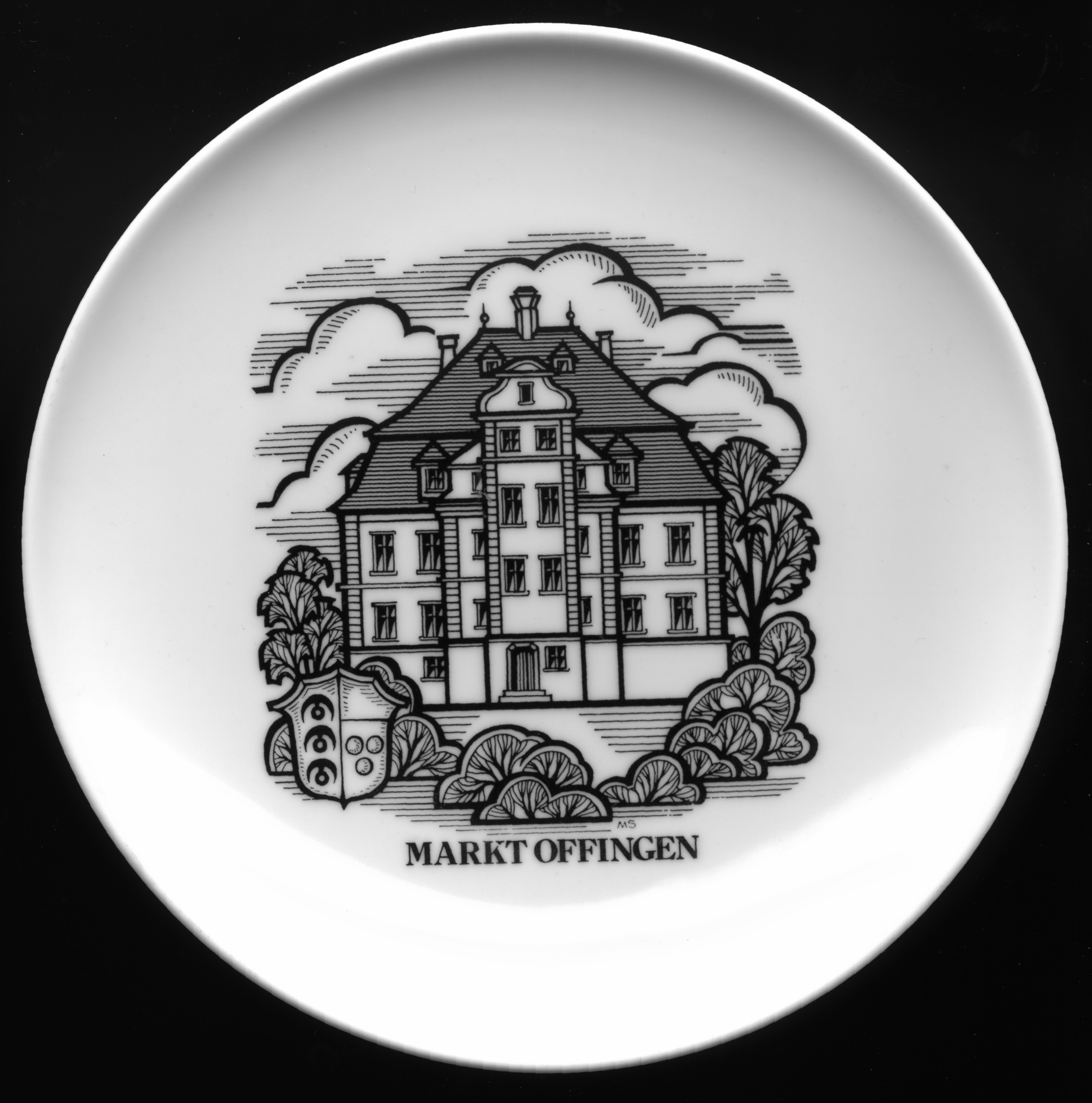 Wandteller für eine Sportlerehrung 1984 mit einer Darstellung des Offinger Schlosses und des Ortswappens