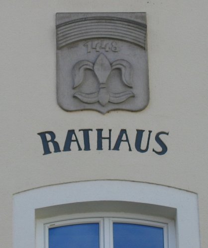 Das Wappen am Erker des Rathauses, ein Granitrelief, enthält das Jahr der Wappenverleihung - 1448 - und deutet den Regenbogen mit seinen sieben Farben an. Im offiziellen Wappen sind nur die drei Grundfarben Rot, Gelb und Blau enthalten, die auch die Stadtfarben darstellen.