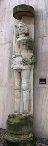 Das Rolandsdenkmal mit dem Rother Stadtwappen steht an der Wand der Sparkasse in Roth, Kugelbühlstraße 4