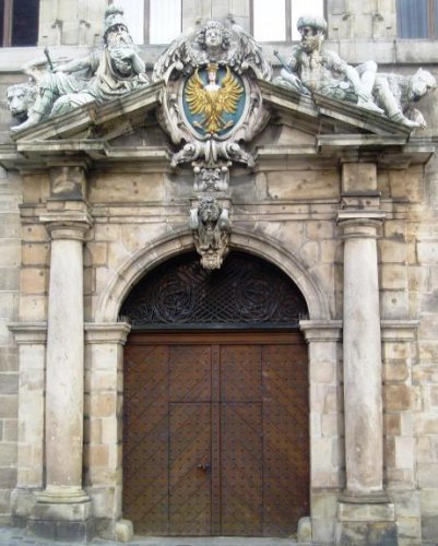 Das Große Wappen der Stadt Nürnberg an einem der drei Portale am Nürnberger Rathaus