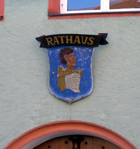 Das Wappen der Stadt Pappenheim über dem Eingangsportal des Rathauses