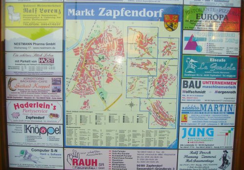 Das Wappen von Zapfendorf auf der Werbetafel der örtlichen Firmen