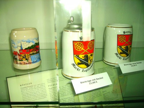 Die im Rathaus von Zapfendorf ausgestellten Bierkrüge mit dem Wappen können käuflich erworben werden.