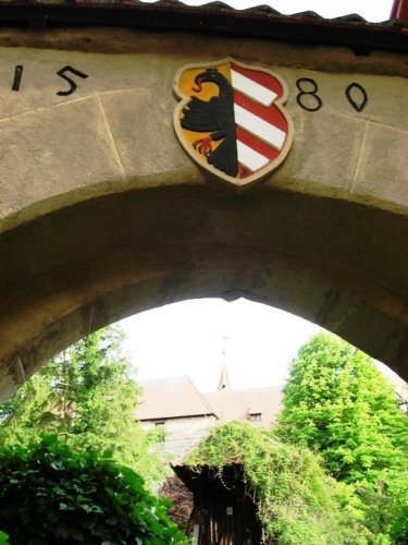 Das Wappen der Stadt Nürnberg in Lauf an der Pegnitz am Steg neben Glockengießer-Spitals zum Wenzel-Schloss