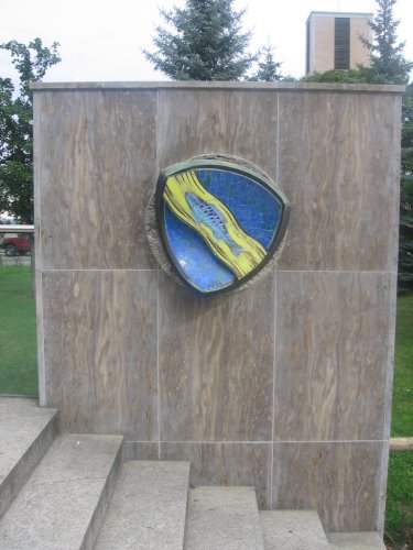 Das Wappen von Fischbach befindet sich am Treppenaufgang zum Rathaus von Nürnberg-Fischbach.