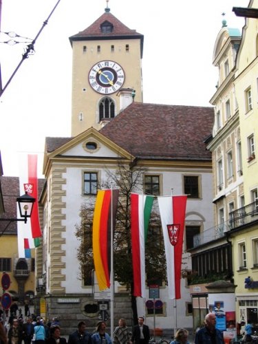 Neben der deutschen und der italienischen Fahne weht rechts die Fahne von Regensburg mit dem aufgelegten Stadtwappen.
