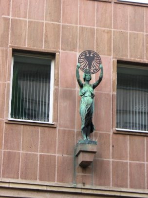 Das Wappen der Stadt Nürnberg, getragen von der Figur der "Nuremberga"