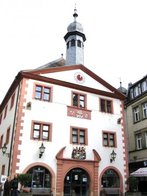 Das Wappen der Stadt Bad Kissingen am alten Rathaus (oben links)