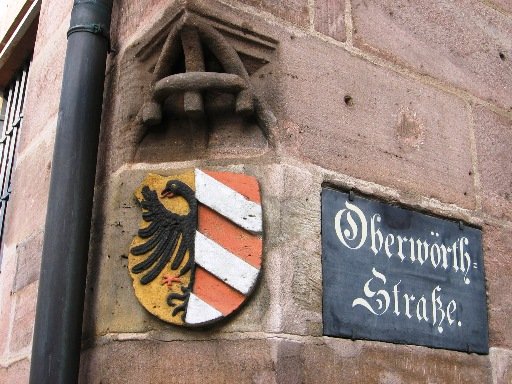Da Wappen der Stadt Nürnberg an einem Eckhaus in der Oberwörthstraße