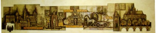 Der Wandfries im Hotelgasthof "Wilder Mann" in Rückersdorf zeigt links unten das Nürnberger Wappen. Dargestellt ist die Goldene Straße von Nürnberg nach Prag.