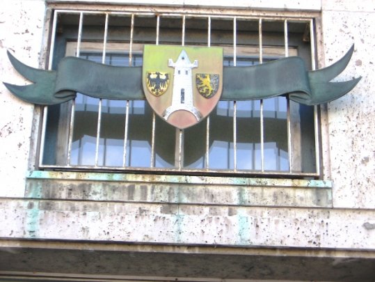 Das Wappen der Stadt Schwabach über dem Rathausportal