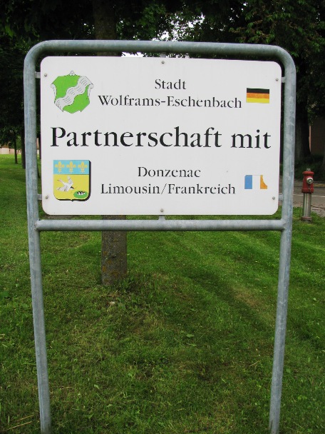 Partnerstadttafel der Stadt Wolframs-Eschenbach mit den Wappen von Limousin, Wolframs-Eschenbach und Deutschland