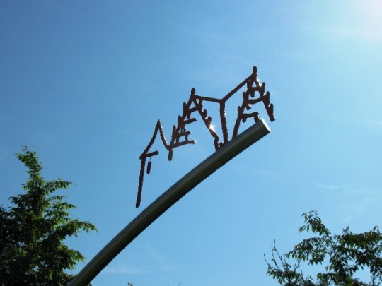 Das Logo der Stadt Roth an einer Plastik neben dem Parkplatz der Firma Bayka