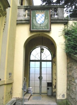 Das bayerische Rautenwappen am Eingang des Rathauses in Schillingsfürst