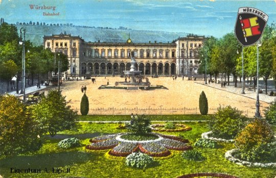 Ansichtskarte mit dem alten Bahnhof von Würzburg und dem Stadtwappen